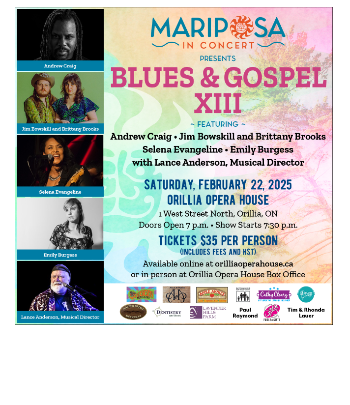 Mariposa in Concert’s (MIC) wildly popular ‘An Evening of Blues & Gospel’ Show returns Saturday February 22, 2025 at the Orillia Opera House with another incredible lineup of all-star vocalists and musicians assembled, arranged and directed by Orillia’s own JUNO award winning producer, Lance Anderson.