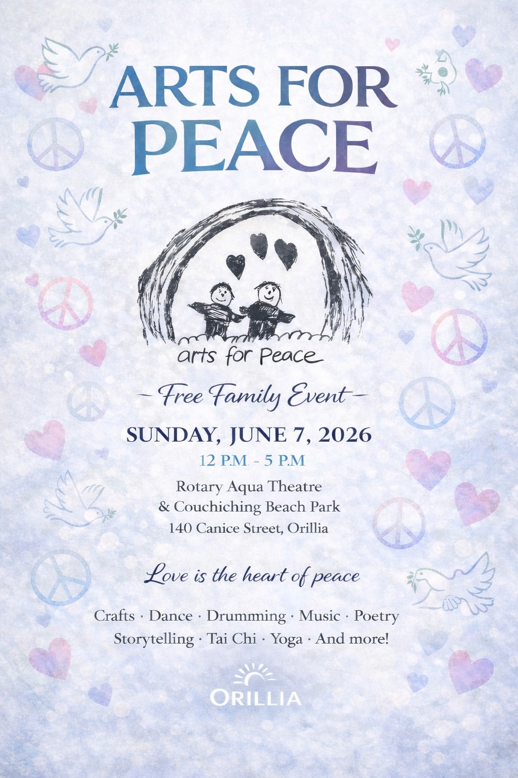 The theme of our 2026 event is “Love is the Heart of Peace”. It will take place on Sunday June 7 from 12-5PM at Rotary Aqua Theatre, 140 Canice Street, Orillia.