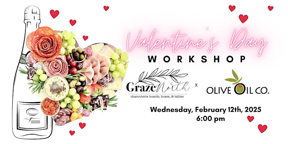 Located at The Olive Oil Company, in Orillia, 112 Mississaga St E., our workshop will teach you all the tips and tricks to create your own heart shaped charcuterie board, discovering the importance of variety, balance, and delicious food pairings.