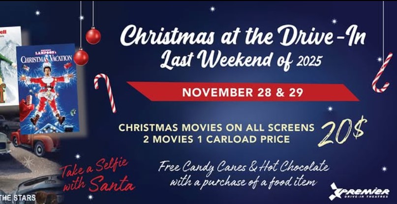 Celebrate the final weekend of the 2025 season with Christmas at the Drive-In at the Sunset Drive-In on November 28 and 29. Enjoy two holiday movies per carload for $20, free candy canes, and free hot chocolate with any food purchase. Santa will be on-site for photos, and pets are welcome. A festive family outing under the stars.