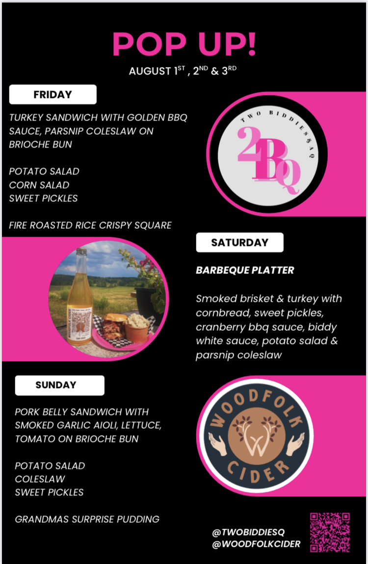 Woodfolk cider is hosting Two Biddies and a Q all long weekend!
