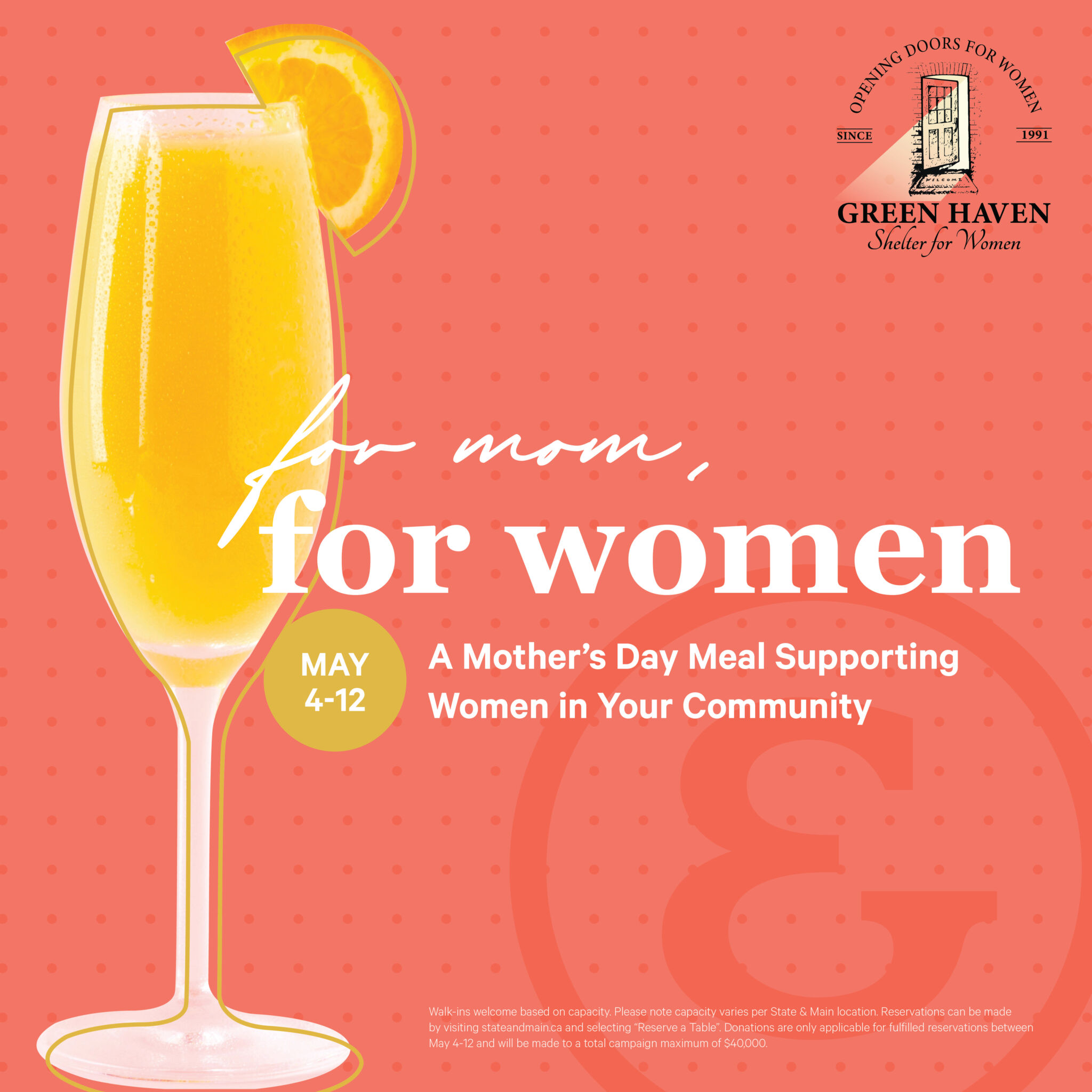 Leading up to Mother’s Day, State & Main is helping families celebrate Mom while fundraising for a great local cause. Through its third annual For Mom, For Women campaign, State & Main will donate $10 to Green Haven Shelter for Women for every fulfilled Mother’s Day reservation between May 4 and May 12 at the Orillia State & Main location.