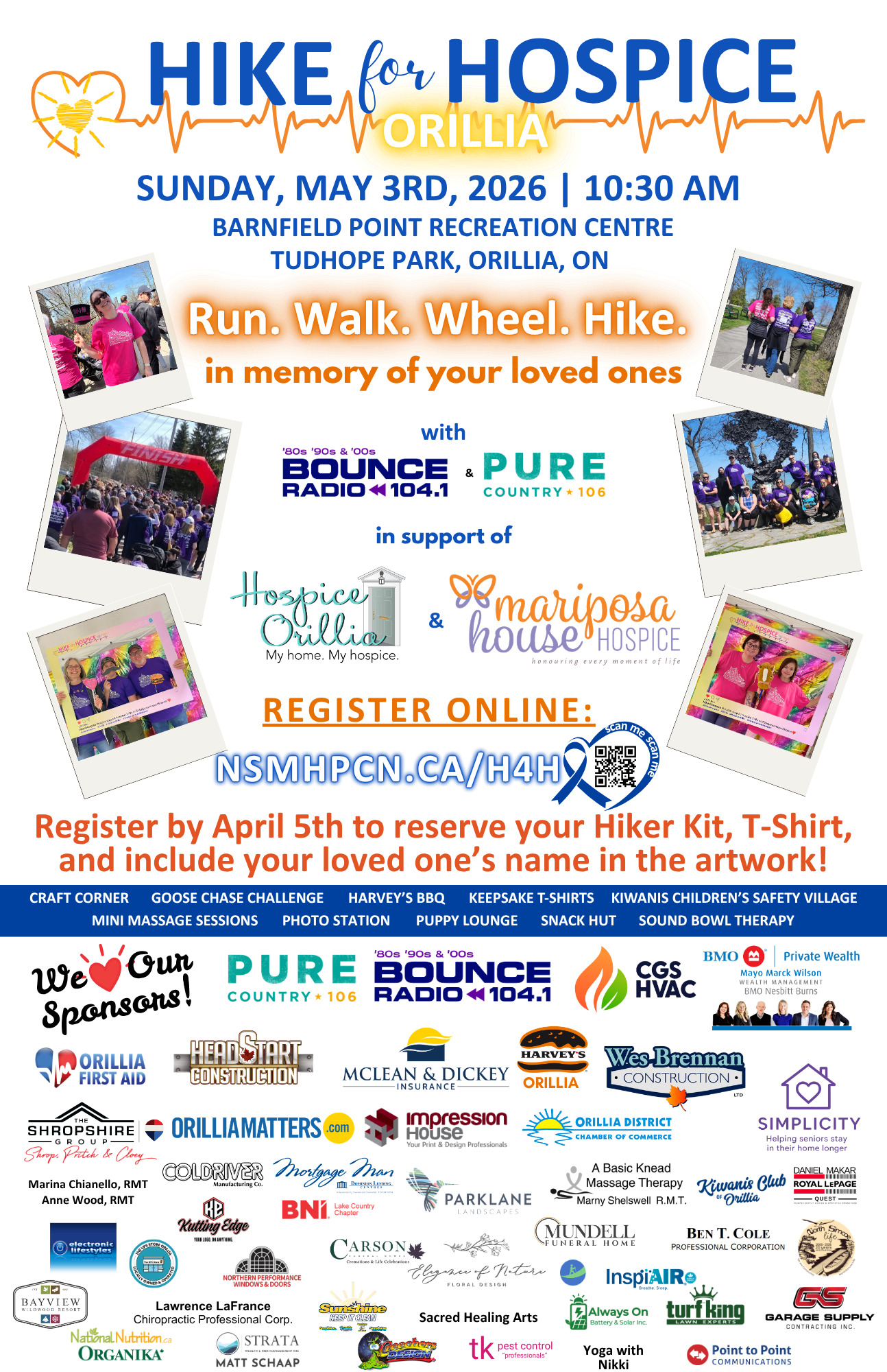 On Sunday, May 3rd, individuals and families from around the region will join in remembering their loved ones through the annual Hike for Hospice! This event is integral for both organizations as it enhances our sense of community, increases awareness of Hospice Palliative Care, and raises much-needed funds. 100% of the proceeds donated to the Orillia Hike for Hospice, stay in the Orillia area by directly supporting the services offered by Hospice Orillia and Mariposa House Hospice; these organizations work together to provide services across the continuum of hospice palliative care, from diagnosis through end-of-life, including bereavement support for surviving loved ones.
