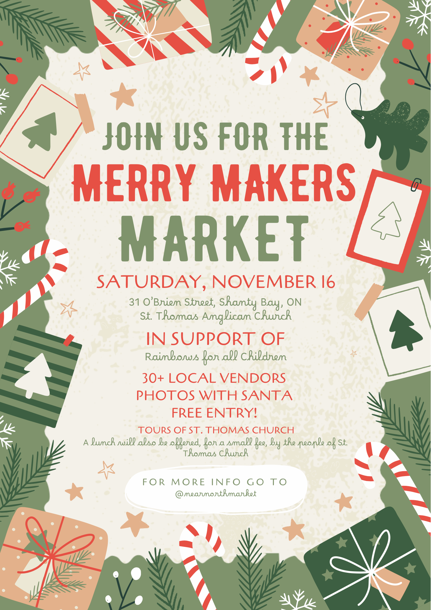 The Merry Makers Market is an annual holiday market held in the beautiful village of Shanty Bay! The market lines O’Brien Street in the heart of the village and there are additional vendors both inside and out at the St. Thomas Church Hall (28 Church Street, Oro Medonte). This event hosts 30+ local food and artisan vendors across a variety of vendor categories! Santa will also be in attendance from 12pm-2pm – photos with Santa are free but a donation to the chosen charity for the year is greatly appreciated! Over the past two years the market has supported both the David Busby Centre, as well as Big Brother Big Sisters of Barrie. This year’s chosen charity is Rainbows for all Children Canada – an non-profit organization supporting children and teens grieve and grow after loss. Come out, shop local, and feel the holiday spirit come alive!