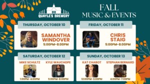 Come out and enjoy live music at Quayle’s Brewery! Thursday October 10th, 5-8pm - Samantha Windover Friday October 11th, 5-8pm - Chris Staig Saturday October 12th,1-4pm - Mike Schultz Saturday October 12th, 5-8 - Kyle Wauchope Sunday October 13th, 12-3pm - Kat Chabot Sunday October 13th, 4-7pm Stephan Bernard