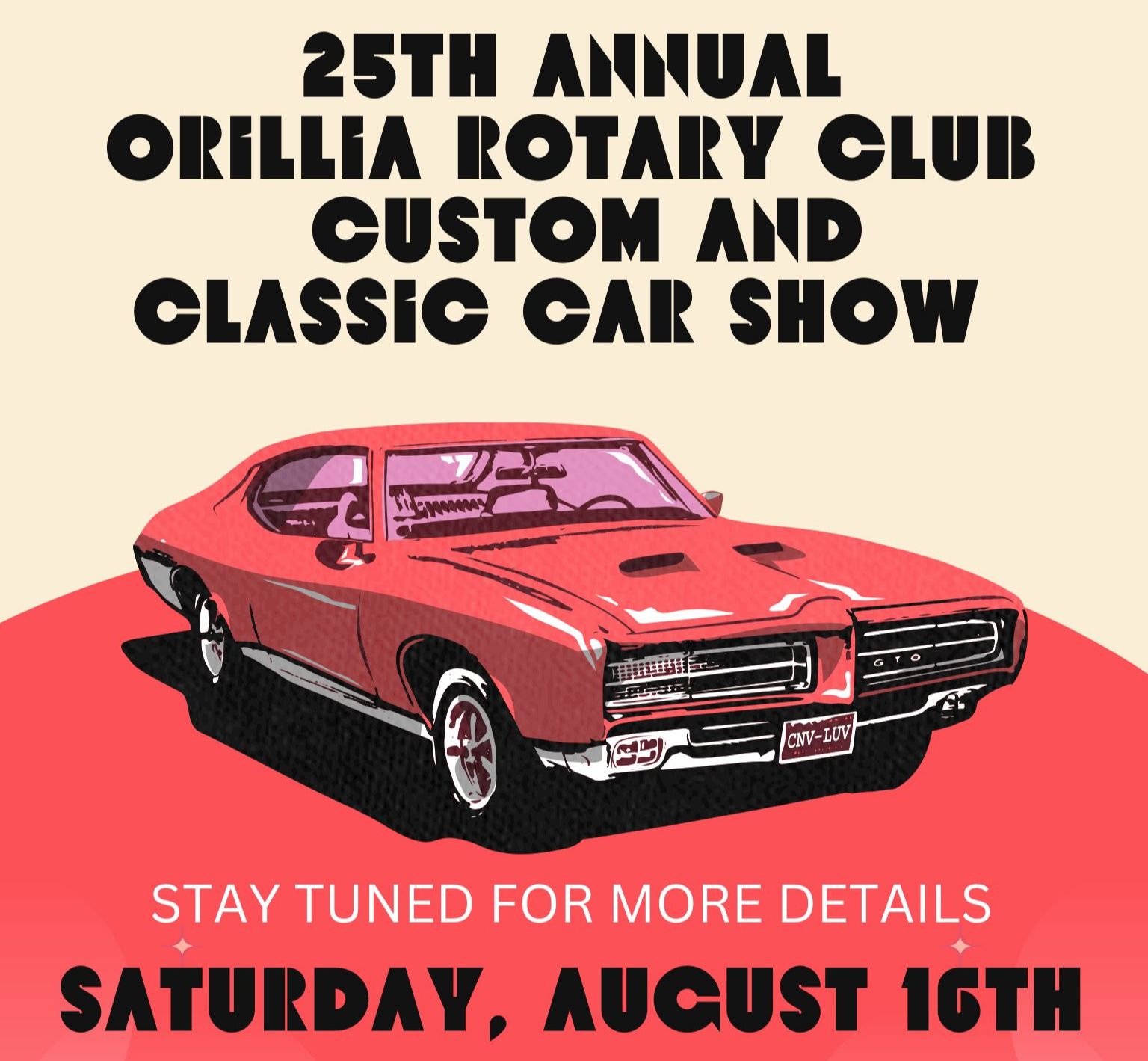 The Rotary Orillia Classic & Custom Car Show is celebrating its 25th anniversary on August 16th, 2025! Up to 300 cars will be displayed downtown along six full blocks of Mississaga Street (Front Street to Albert Street) and also along Peter Street South. A download of the Car Show street map is available above.