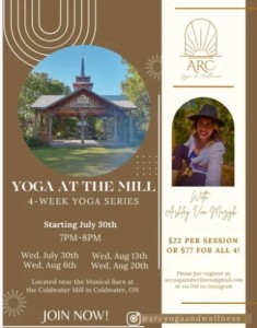 Find out more »4 week series $22 per session or $77 for all Located near the Musical Barn at the Coldwater Mill. Pre-register at arcyogaandwellness@gmail.com