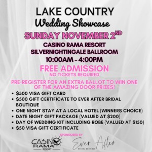 Find out more »Lake Country Wedding Showcase We’re back and BIGGER than ever at our NEW location — Casino Rama Resort, Silvernightingale Ballroom Sunday, November 2nd, 2025 FREE admission (no tickets required!) Pre-register for an EXTRA ballot to win amazing prizes like a $500 VISA gift card, a $500 gift certificate to Ever After Bridal Boutique, hotel stays, gift packages & more! Register here: https://forms.gle/wMYYBpaA5peNprSK9 Tag your fiancé, bestie, or bridal crew — this is the wedding event you won’t want to miss!