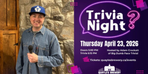 Find out more »📣 Don't Miss Our Next Trivia Night | Thurs April 23, 2026 🤣 Adam returns to Quayle's with his always entertaining (and sometimes hilarious) questions—so grab your crew and get your tickets before they’re gone! Did we mention the ticket price include a full pour of beer or glass of wine? Trivia Night at Quayle's Brewery ⭐ Host: Adam Crockatt, Big Dumb Face Trivia 🗓️ Thursday April 23, 2026 ⏰ 5-8 PM 🎟️ Tickets: $14.50 + tax & ticketing 👉 https://www.showpass.com/trivia-quayles-40/
