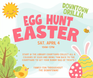 Find out more »The Downtown Orillia Egg Hunt will run throughout the downtown from 10am-12pm, and will span the entire length of Mississaga St, from Albert St. to Front St. The Library Courtyard will be the designated spot to trade Easter eggs collected for yummy treat bags. Additionally, a variety of activities will be scattered throughout the Bunny Trail for all to enjoy. The Easter Bunny himself will be making a special appearance for photo opportunities, along with a bubble party, activities and…