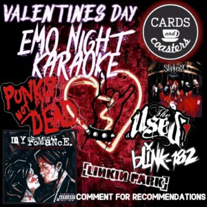 Find out more »Cards And Coaster is Hosting Emo/Alternative Karaoke! Didn't have a date for Valentines? Or maybe Valentines didn't go to plan? Come sing from Over 200 emotional song list! Feel free to come dressed in your emo/punk/metal or whatever We will hand out Prizes for Best Performance Best Spirit and Best Effort (Based on attendance) Feel Free to message us to request songs This event is 19+ *tickets are non refundable*