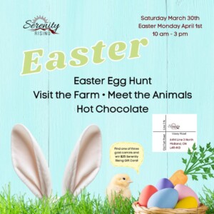 Find out more »ASTER at the FARM March Saturday 30th & Easter April 1st (closed Easter Sunday) 10am-3pm Admission is $10 a person with lots of fun activities! Meet the animals, stroll the farm, enjoy hot chocolate by the fire and an Easter Egg Hunt with goodies for the kids! Plus! If you find one of three gold carrots, you’ll win a $25 Serenity Rising Gift Card! We are offering horse rides and s’mores packages to be purchased as well as our DIY…