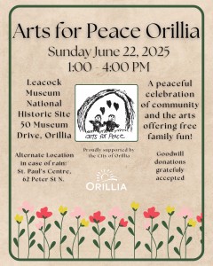 Find out more »After a 6 year hiatus, Arts for Peace will once again bring folks together for a peaceful summer afternoon of music, crafts, dance, storytelling, yoga, bubbles and community. Started by members of Project Ploughshares Orillia, a non-governmental organization that worked with churches, governments and civilian groups to prevent war and promote peace, the sunny festival on the grounds of the Leacock Museum has been honouring peacemakers from here and from around the world since 1983. A cancellation due to weather,…