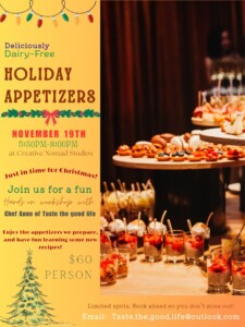 Get ready to wow your guests this holiday season! In this fun, hands-on workshop, you’ll learn how to create a stunning spread of festive appetizers that look as good as they taste. From elegant bites to hearty nibbles, we’ll cover crowd-pleasing recipes that are easy to prepare, easy to serve, and perfect for any celebration.