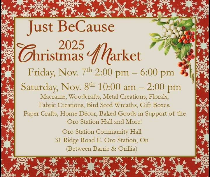 Visit Oro Station Community Hall for woodcrafts, baked goods jams & preserves, stocking stuffers, pretty paper craft, macrame and more!