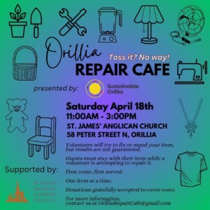 The Spring edition of the Orillia Repair Cafe will take place on Saturday April 18 from 11-3PM at St James Anglican Church in downtown Orillia. This is a free community event hosted by Sustainable Orillia. It brings together volunteers and attendees to repair various items, promoting sustainability and reducing waste. The event is held twice a year, with skilled volunteers attempting repairs on a wide range of items. The goal is to encourage repair over replacement, leading to conservation of…