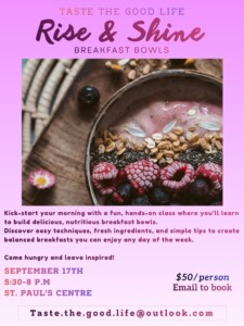 Start your day deliciously with our hands-on breakfast bowl class! Learn to craft vibrant, nutritious bowls, filled with fresh fruits, wholesome and flavorful toppings. Guided by a professional chef, you’ll discover tips and techniques to make breakfast both beautiful and satisfying. Perfect for food lovers, morning enthusiasts, and anyone looking to elevate their first meal of the day! Email taste.the.good.life@outlook.com to reserve your spot. Space is limited to 12, so don't delay!