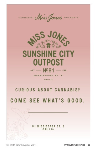 MISS JONES SUNSHINE CITY OUTPOST 81 ONT CA N MIS SIS S A GA S T. E. ORILLIA CURIOUS ABOUT C ANNABIS? COME SEE WHAT ’S GOOD . 81 MIS SIS S A GA S T. E ORILLIA @OrilliaLakeCountry OrilliaLakeCountry.ca 15