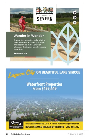 Wander in Wonder A sprawling network of trails, pristine lakes and rivers, and boutique shops and restaurants make Severn an all-season destination for adventurers to explore. severn.ca 20 OrilliaLakeCountry.ca 1-866-329-5959