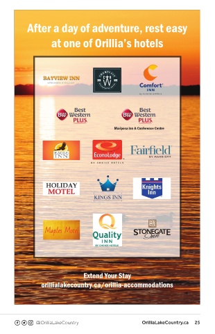After a day of adventure, rest easy at one of Orillia’s hotels Mariposa Inn & Conference Centre Extend Your Stay orillialakecountry.ca/orillia-accommodations @OrilliaLakeCountry OrilliaLakeCountry.ca 25