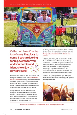 Music Festival. Mainstage performers are always at Mariposafolk.com. OrilliaLakeCountry.ca/stay.