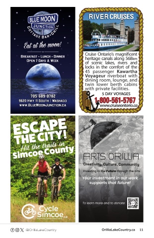 ESCAPE THE CITY! Hit the trails in Simcoe County 10 OrilliaLakeCountry.ca 1-866-329-5959 @OrilliaLakeCountry OrilliaLakeCountry.ca 11